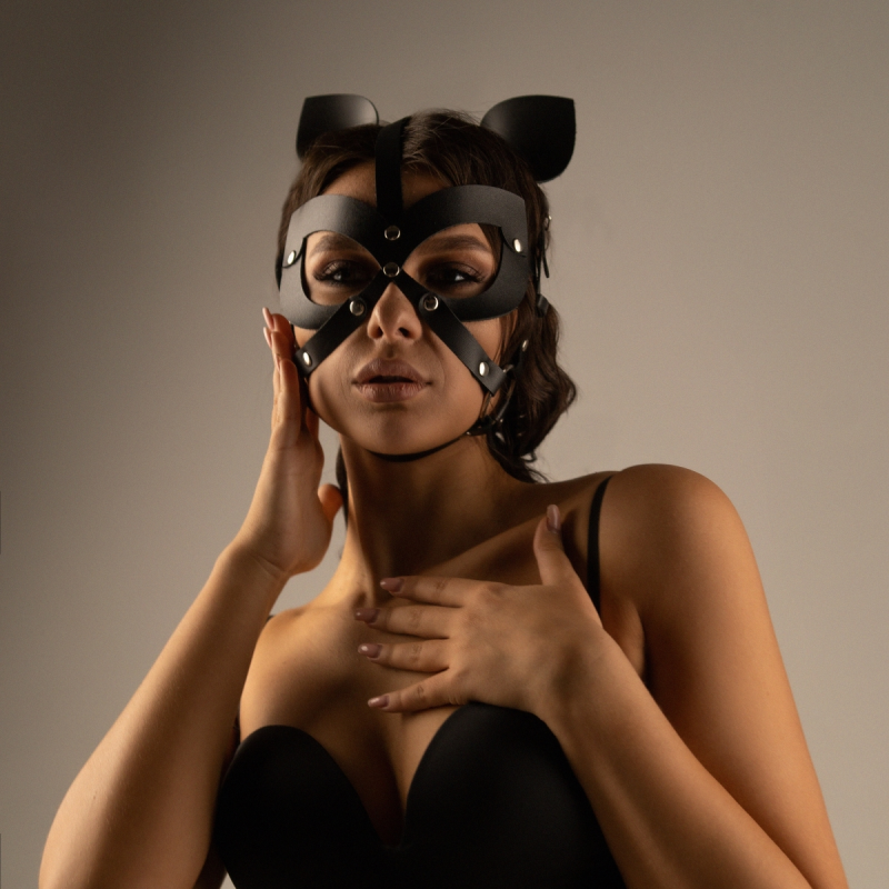 Выполнена маска из натуральной кожи в черном цвете. Крепится на голове при помощи регулируемых ремешков и подойдет для любого размера